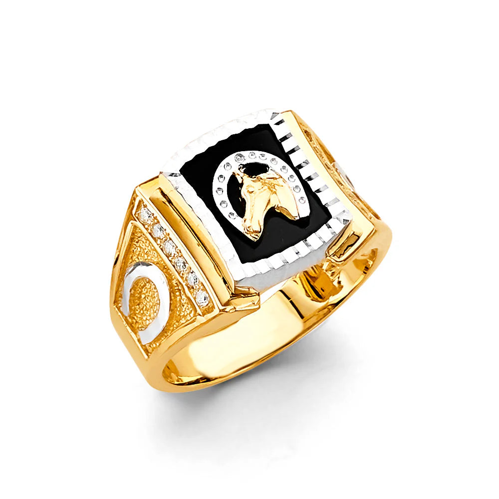 14K Two Tone Gold Onyx Horse Shoe Men's CZ Ring