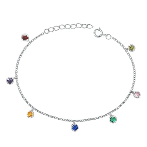 Sterling Silver Rhodium Plated Multi Colored CZs Bracelet-6.5 + 1 inch extension