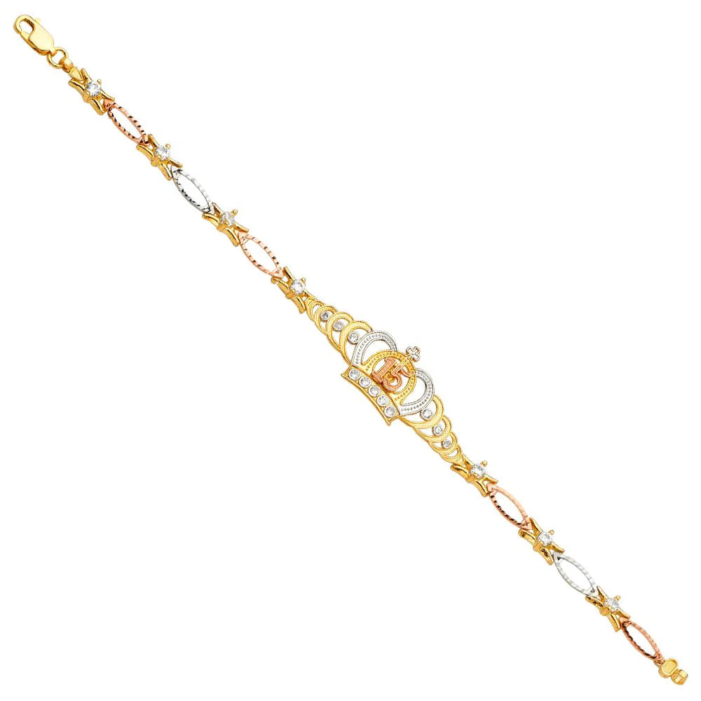 14K Tricolor 15Years Crown CZ Bracelet-7.5 inches