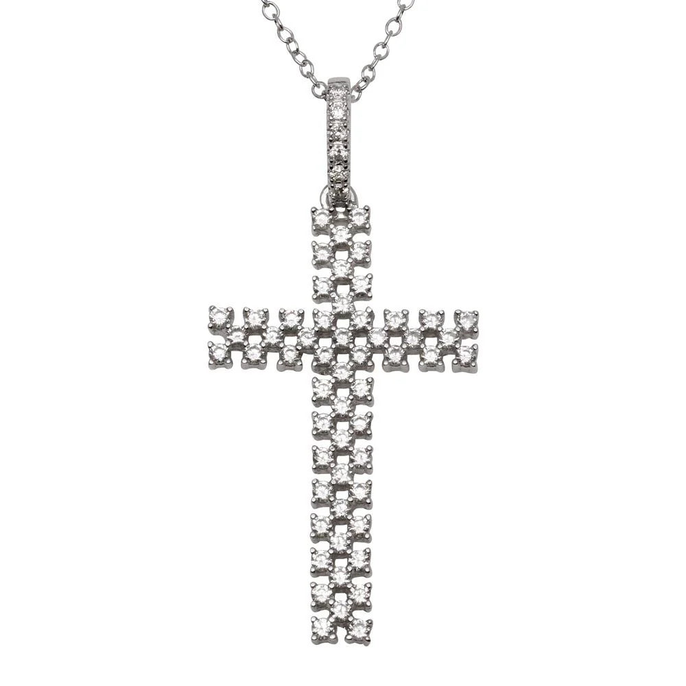 Sterling Silver Rhodium Plated Thin Open Checkered Cross CZ Pendant