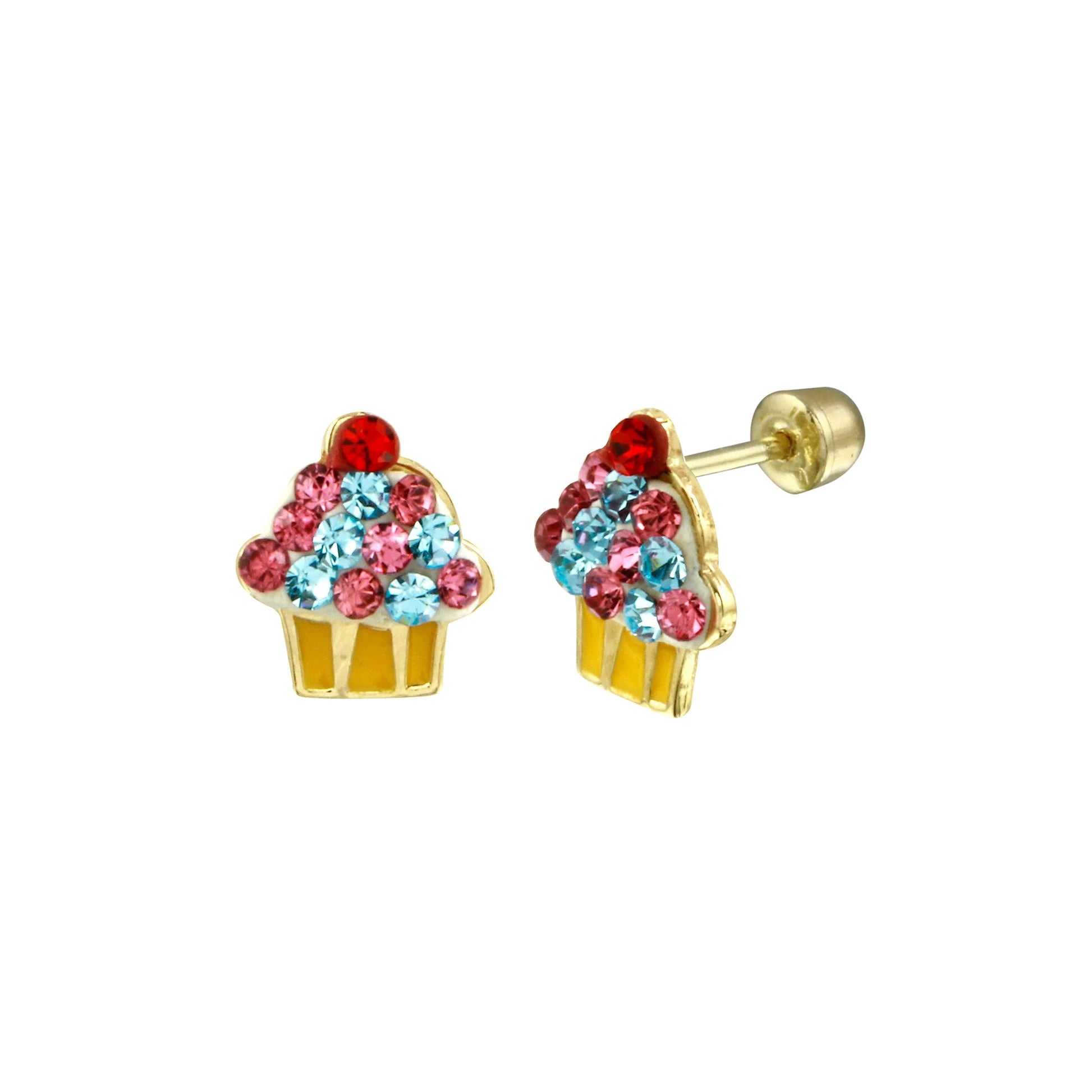 OroTrue 14K Yellow Gold Red Enamel Cupcake CZ Earrings