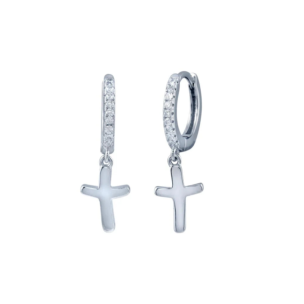 Sterling Silver Rhodium Plated Huggie Cross CZ Earrings