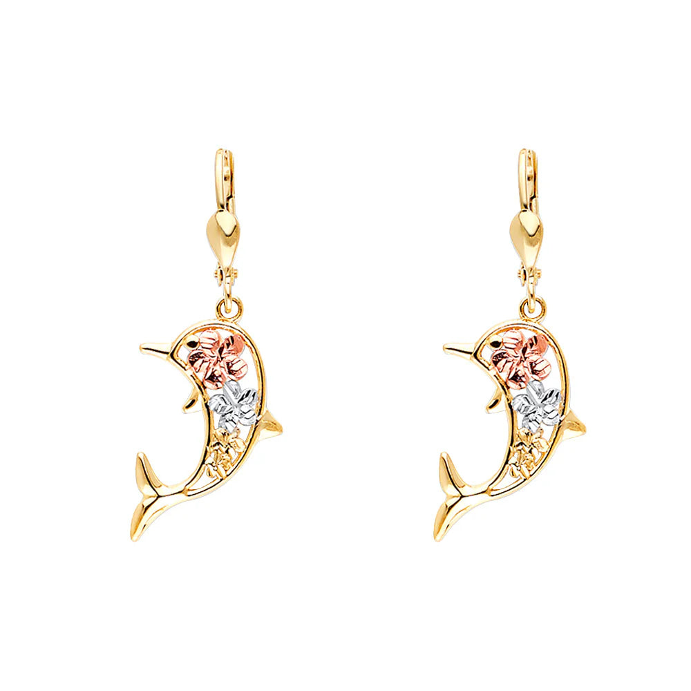14K Tricolor Hawaiian flower Dolphin Lever Back Earring