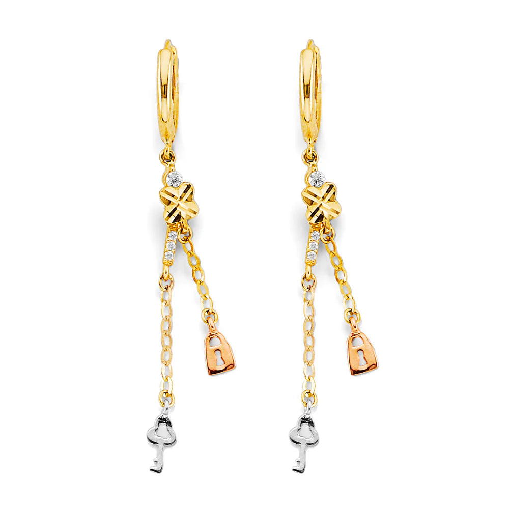 14K Tri Color Gold Hanging Lock And Key Earrings