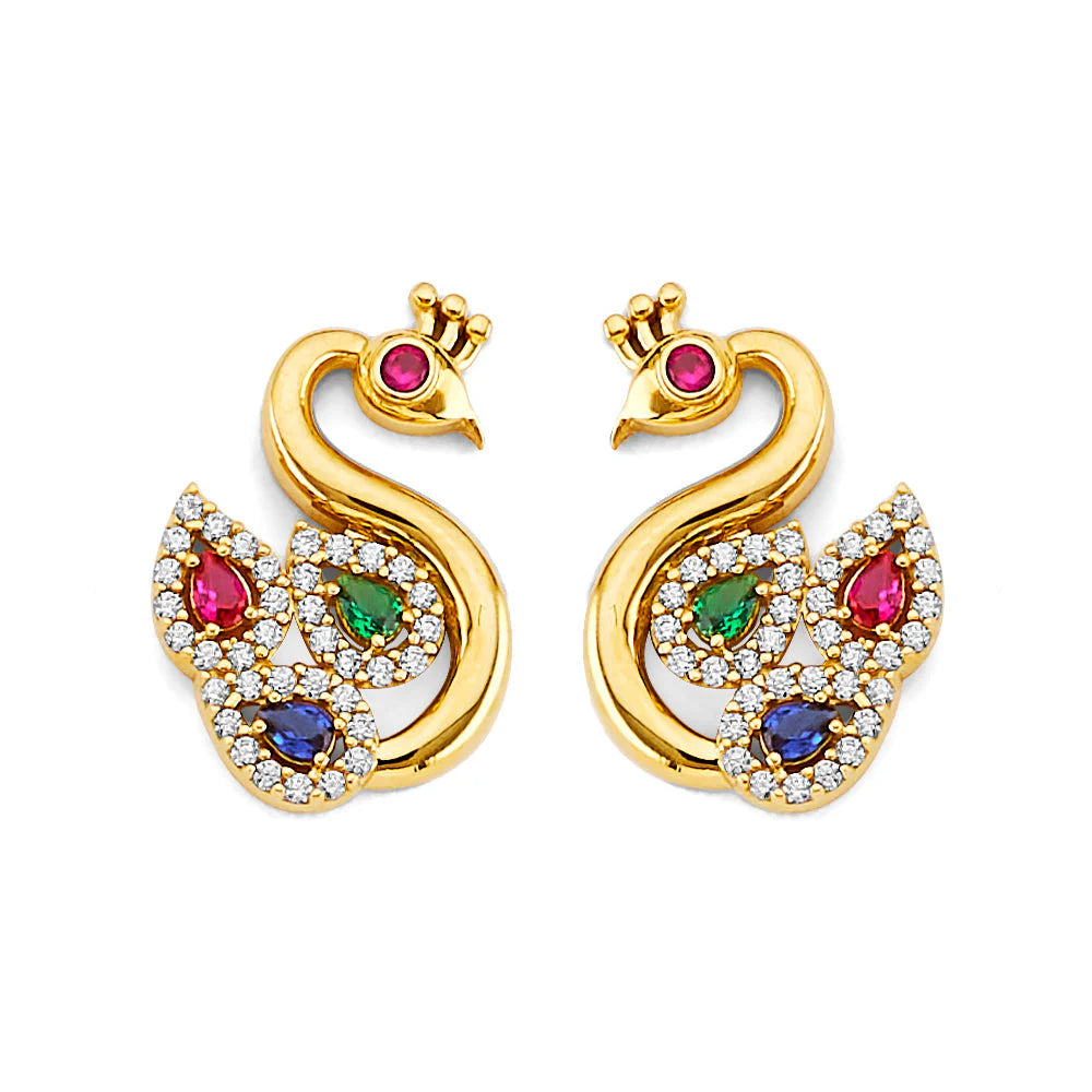 14K Two Tone Gold Swan With Multi Color CZ Earrings