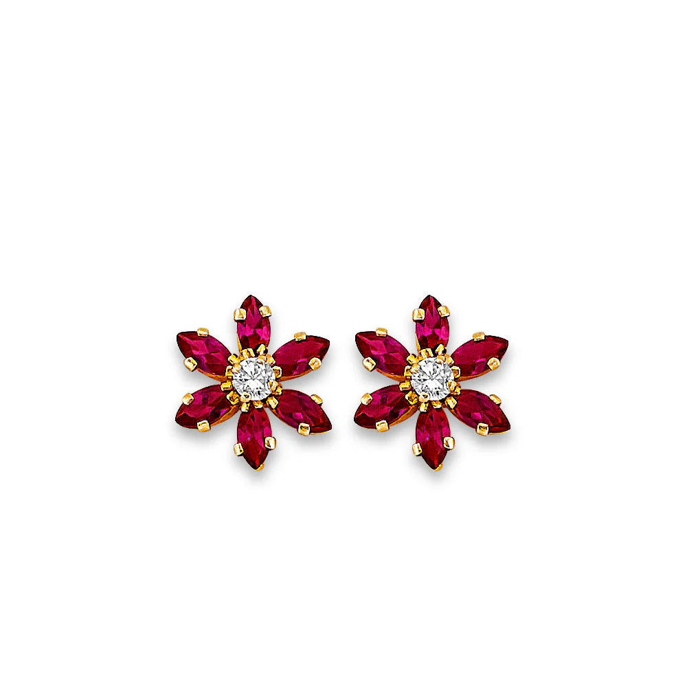 14K Yellow Gold Red Flower CZ Stud Earrings With Screw Back