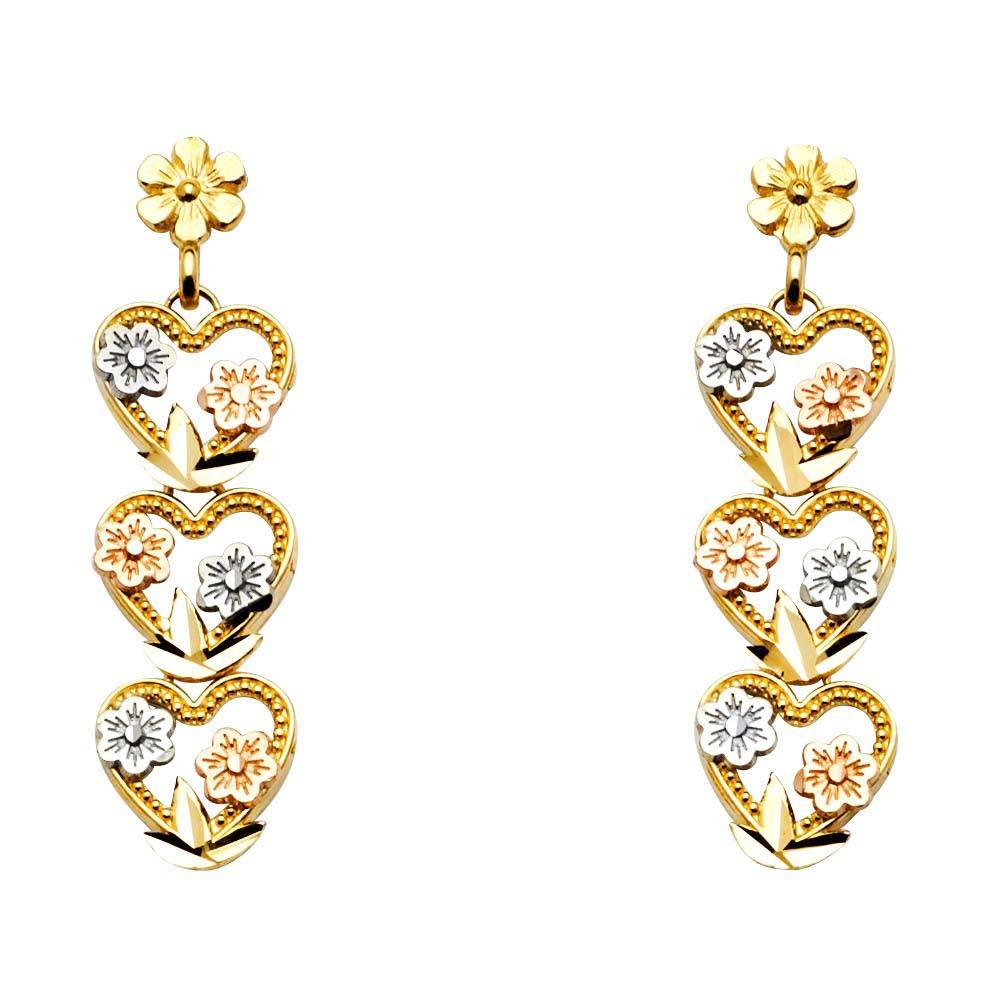 14K Tri Color 8mm Hanging Heart Post Earrings