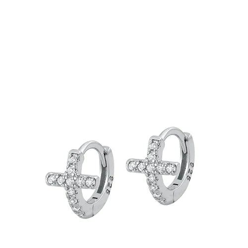 Sterling Silver Rhodium Plated Huggie 7mm Cross Clear CZ Earrings-10mm