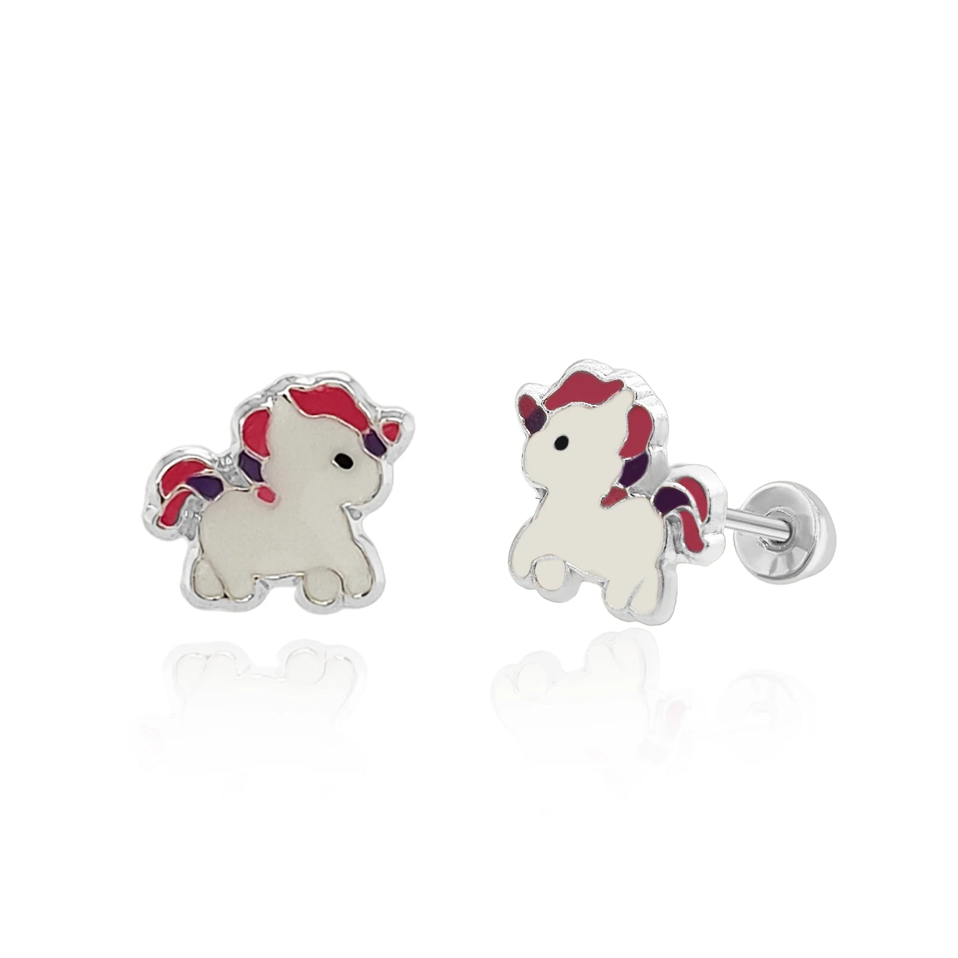 SilaDore Sterling Silver Rhodium Plated Enamel Small Unicorn Screw Back Earring